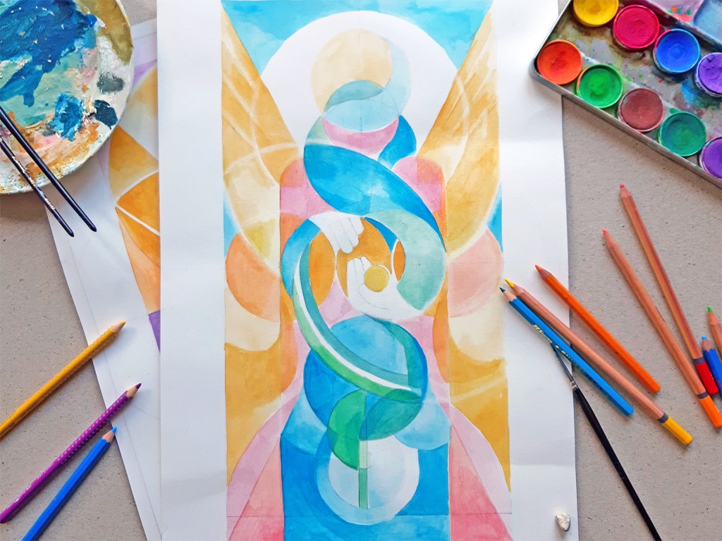 Aus dem ersten Gespräch mit dem Auftraggeber entstand ein Gedanke: „Aus deiner Mitte komme ich…“ und ein einfacher Entwurf. Die ersten Ideenskizzen gedeihen intuitiv, zumeist im kleinen Format, mit Farbstift und Wasserfarben.