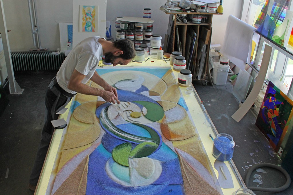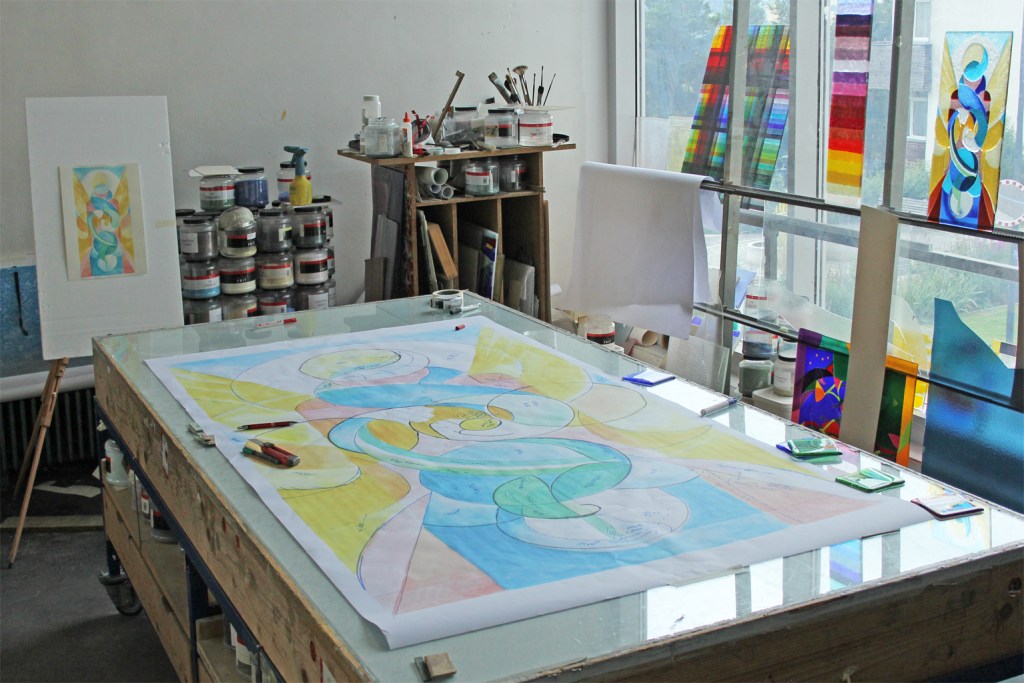 Nach einer letzten Entwurfsoptimierung und Farbbesprechung ging Thomas Stummer in der Glasmalerei Stift Schlierbach ans Werk. Zuerst mussten alle Glasteile, die später als klar motivische Figuration sichtbar sein sollen, zugeschnitten und sorgfältig aufgelegt werden. Was bei einer 2m² großen Glasfläche einiges an Zeitaufwand bedeutet.
