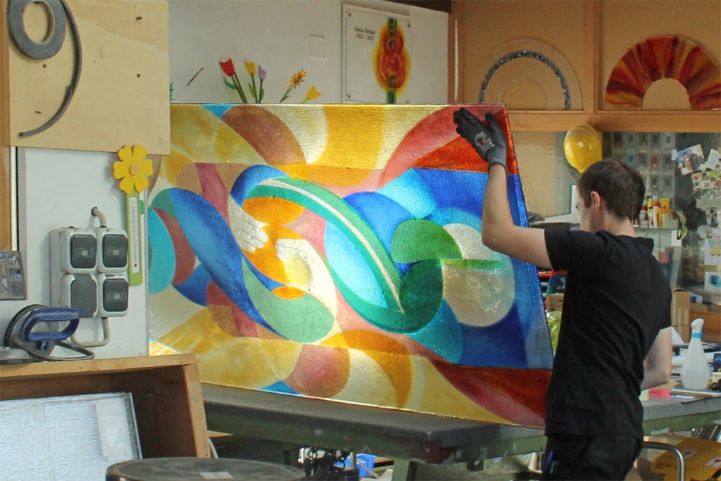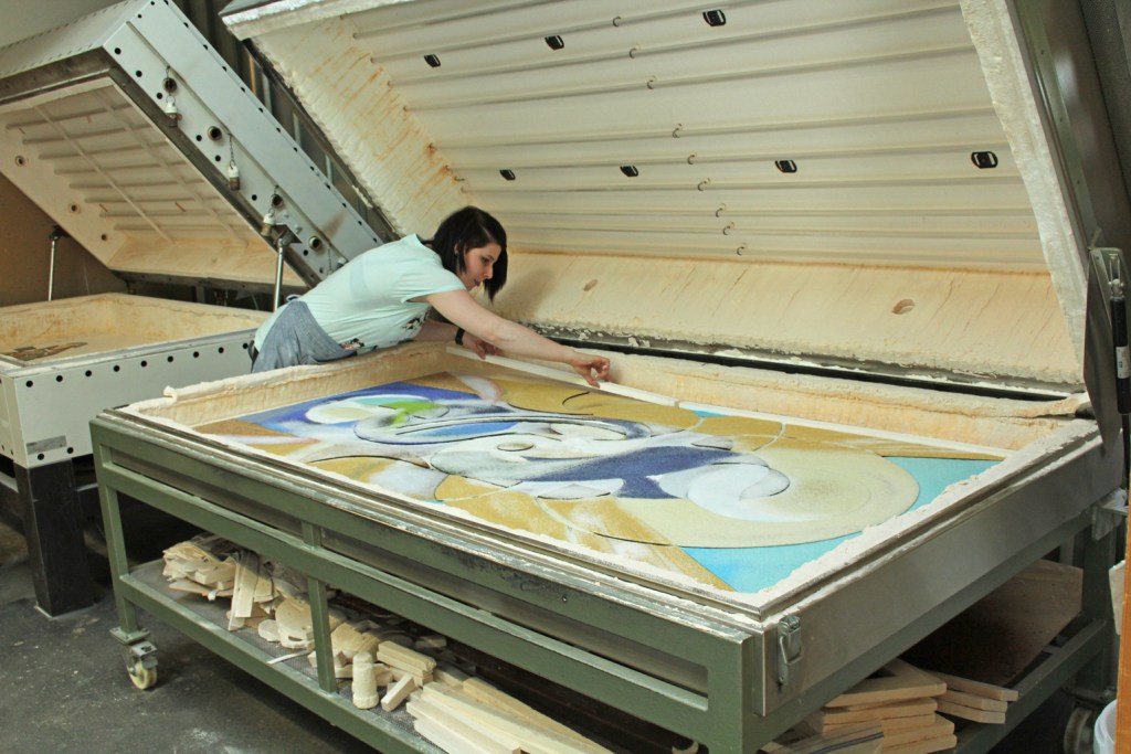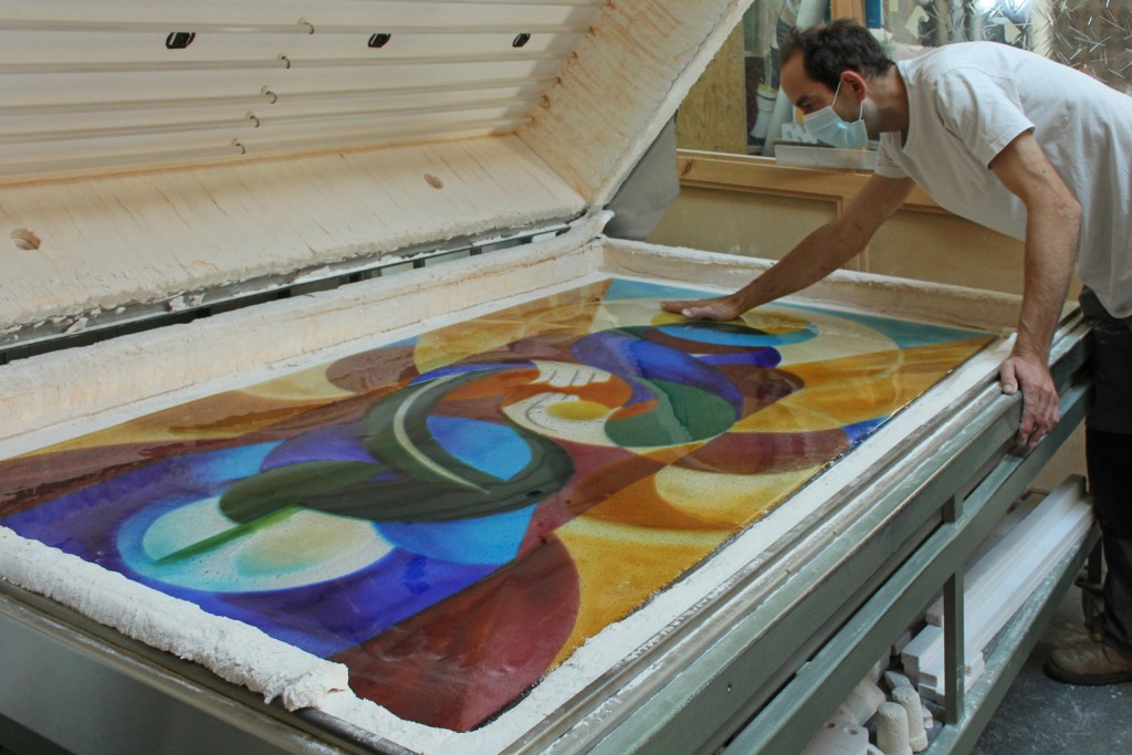 Das Glas wird nun gereinigt und nach einer künstlerischen Besprechung auf eine weitere Schicht aus Sicherheitsglas auflaminiert, um es den Auflagen entsprechend für die Aufstellung oder Montage vorzubereiten.