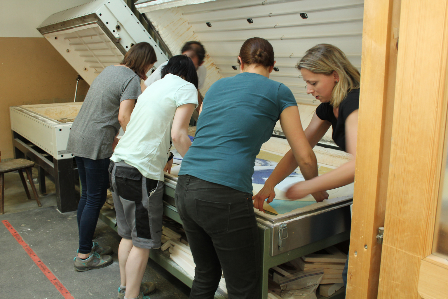 Nach dem Aufstreuen der Fritten wiegt das Glas je nach Entwurf ca. 50 – 100 kg. Um es in den Brennofen zu legen, müssen die Mitarbeiter_innen der Glasmalerei zusammenhelfen. Es darf kein einziges Glasteil, keine einzige Glasfritte verrutschen, was ebenfalls große Aufmerksamkeit und wie man an den Fotos sieht, auch Akrobatik verlangt. Es herrschte große Erleichterung, nachdem das Glas in den Ofen sachgemäß eingelegt war.