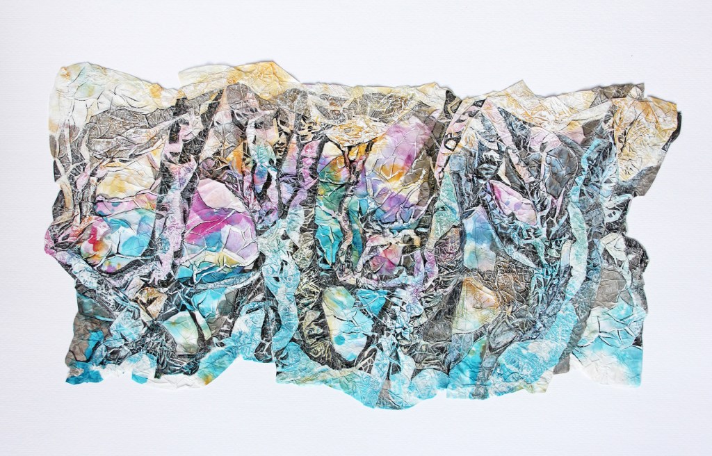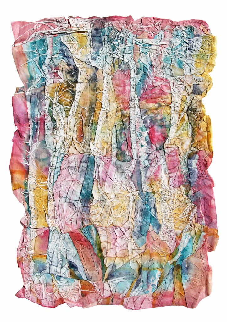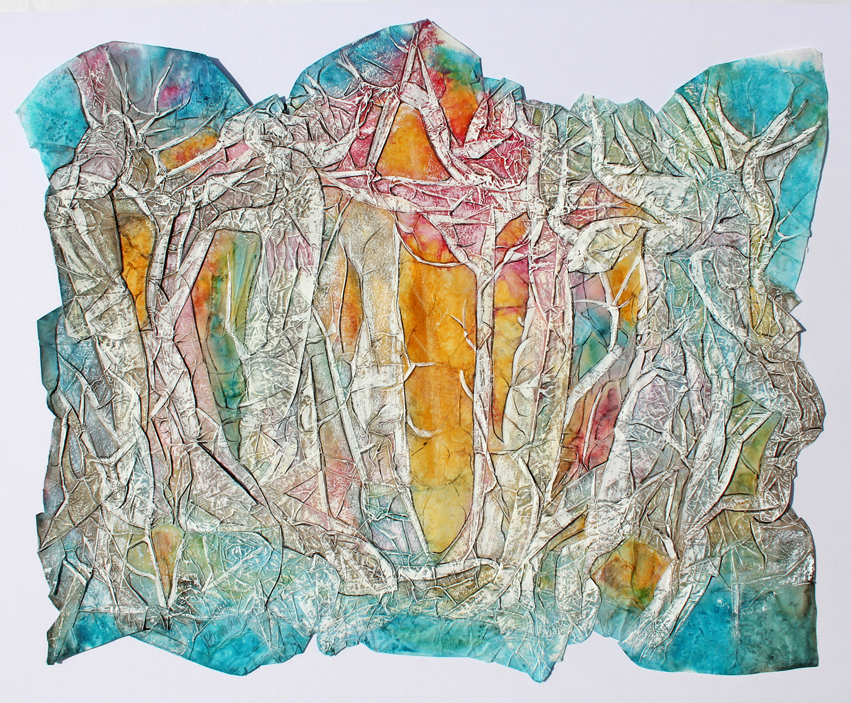 Dennoch, Chinapapier ist leicht reiß- und zerstörbar. Fragil, wie die kulturelle Identität des Einzelnen und das kulturelle Gedächtnis von Gesellschaften, die sich dem Leben zu Liebe stetig wandeln. Die Eigenschaften von Japan- und Chinapapier bieten ein geeignetes Experimentierfeld diesen Wandel prozesshaft zu symbolisieren. Ein dünnes Blatt Papier wird mehrfach mit lichtechter Tusche gefärbt, getrocknet, gefaltet, gepresst, verleimt und schließlich noch einmal bemalt. Im Laufe der Arbeitsschritte wird sichtbar, was zu Beginn unvorhersehbar erscheint. Bäume, Buchten, Wege entstehen. Der materielle Widerstand gibt vor wohin die spielerische Reise geht. Erinnerung und Inspiration formen das Motiv. Das hauchdünne Papier wird zu einer Membran zwischen wirklichen und imaginierten Räumen. Die getrocknete Grafik ist ein Zwischenschritt, der vielleicht schon morgen ein anderes Gesicht und eine neue Geschichte erhält.