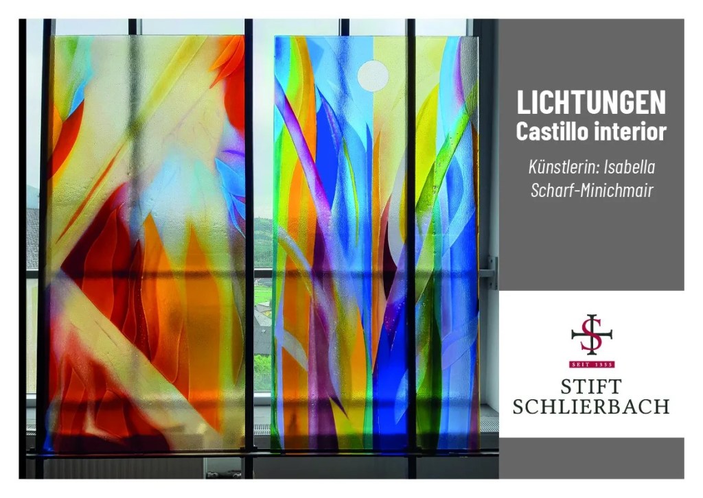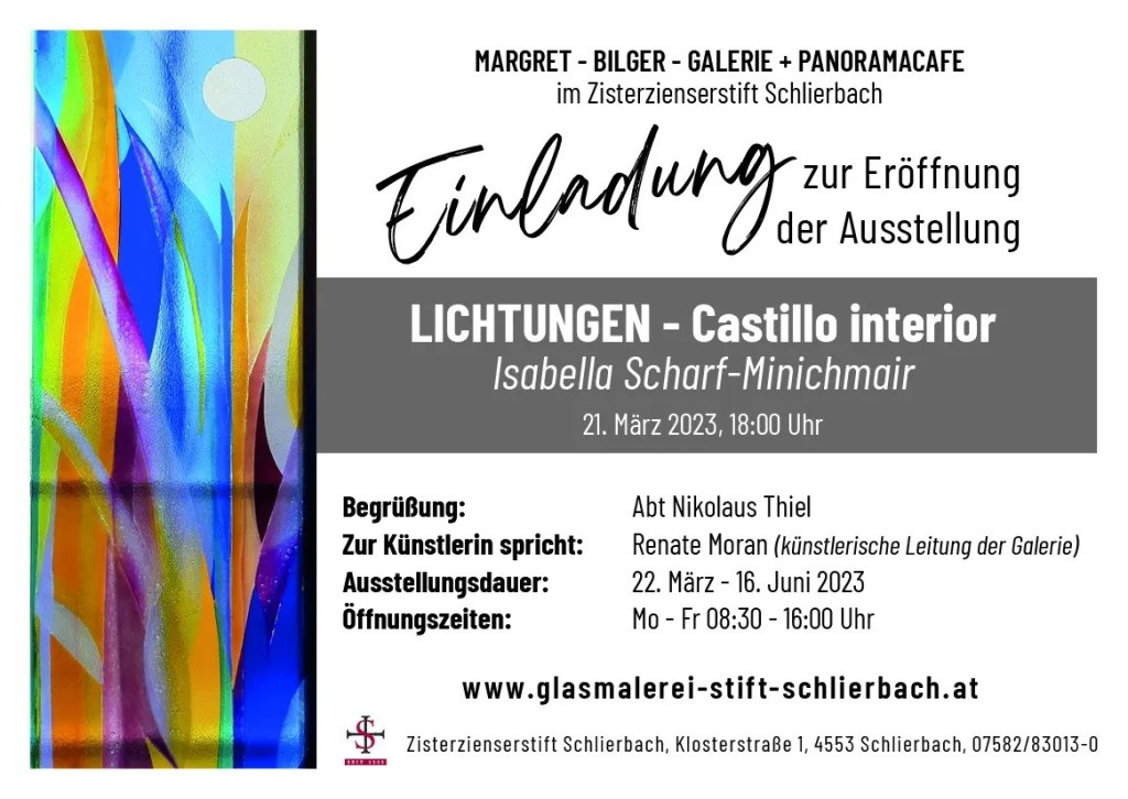 Isabella Scharf-Minichmair studierte Malerei und Grafik und promovierte zum Thema künstlerische „Spurensicherung“ an der Kunstuniversität Linz. Sie arbeitet in ihrer Kunst intensiv mit dem Begriff der Spur und der Verweiskraft der künstlerischen Spurensuche. Seit 2015 setzt die Malerin in Zusammenarbeit mit der Glasmalerei Stift Schlierbach architekturbezogene Aufträge in Glasfusing-Technik für den sakralen und öffentlichen Raum um. In ihrem Atelier auf Burg Altpernstein findet sie jene inneren Orte und Themen zum Zeitgeschehen, die sie in den Werken der Ausstellung L I C H T U N G E N präsentiert.