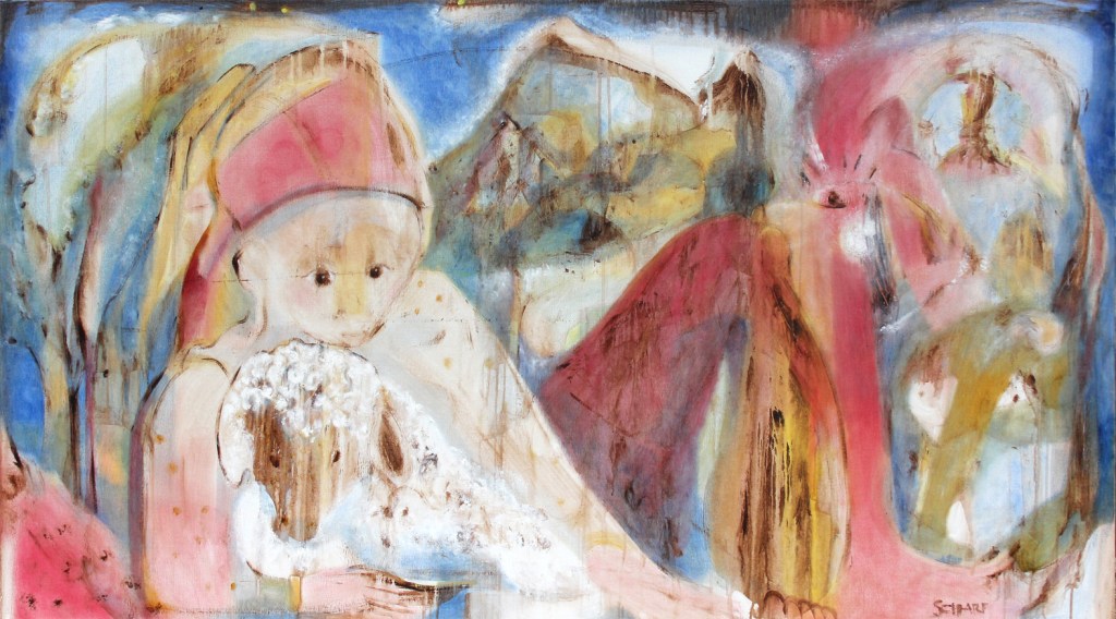 2. THE GIRL, THE LAMB, THE DOG AND GODS EYE IS WATCHING, 100 x 180 cm, Oil on canvas, 2022