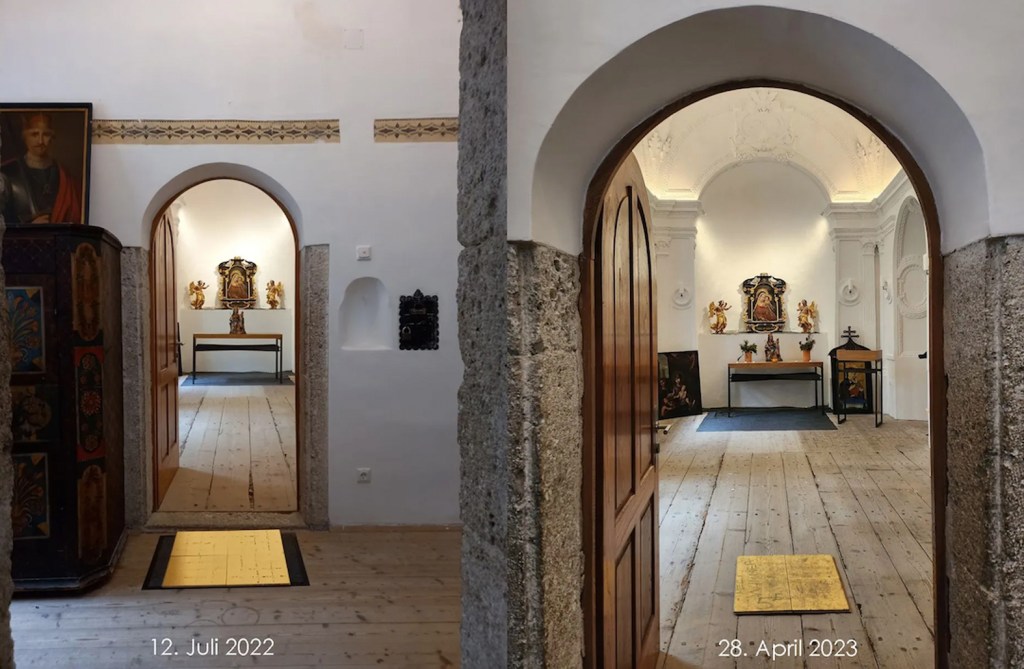 Passend zu GOLDBURG. ART zeigt Johannes Angerbauer-Goldhoff die Rauminstallation EU27 Austria Bodengold. Sie lädt den Atelier-Besucher zum kurzen Verweilen ein. Die HUMANgold Küche dient dabei als ein Ort der Kommunikation und der Verbindung von drei sozialen Gruppen. Der Arbeiter-, Bürger- und Industriellen Gruppe. Bodengold Relikte aus der Burgkapelle werden zu Wandobjekten aufgerichtet. www.human.gold