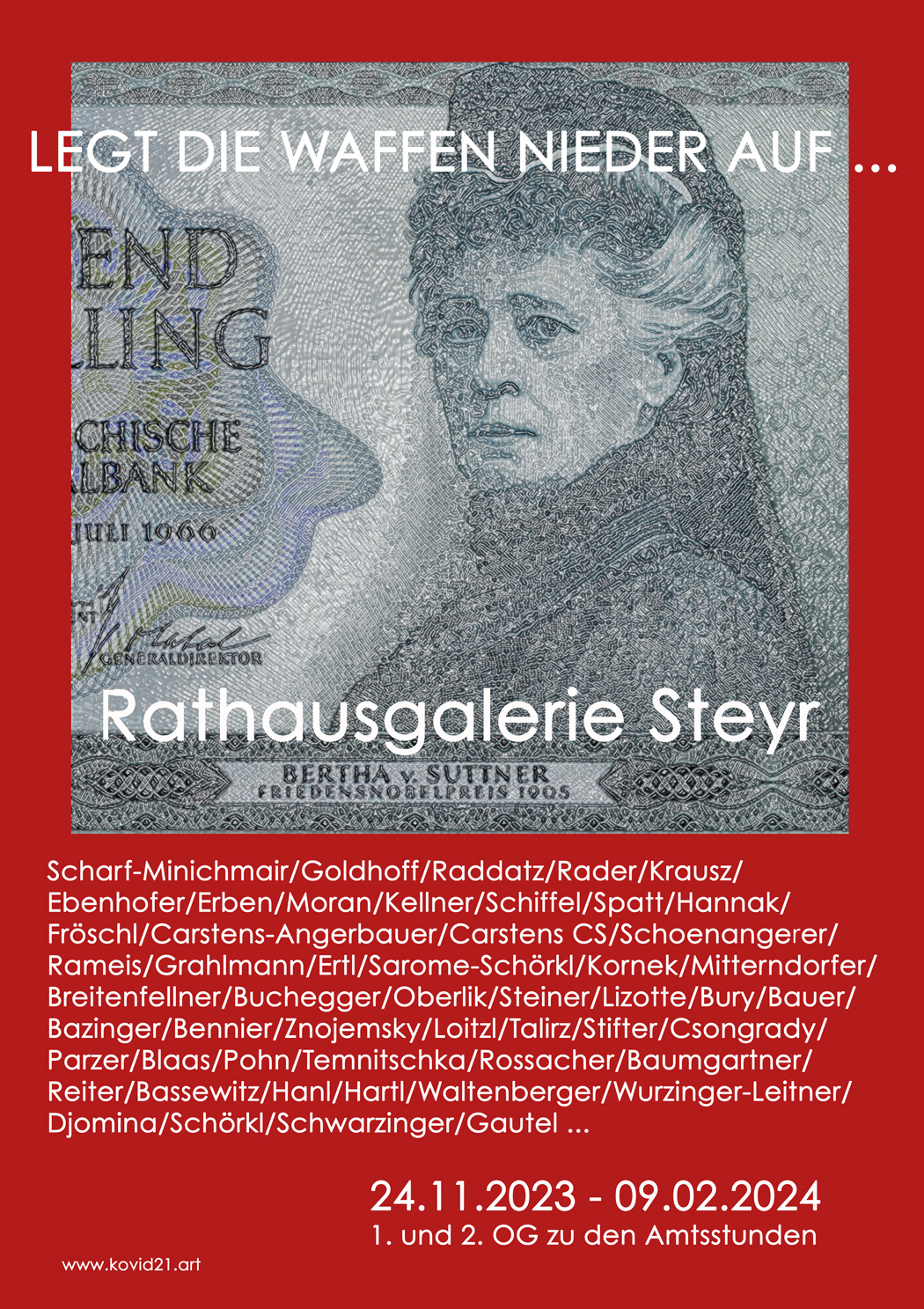 Die Rathausgalerie Steyr zeigt eine Ausstellung mit über 50 Künstlerinnen und Künstlern zum Thema Antikrieg. Zu sehen ist die Schau ab 24. November 2023 zu den Amtszeiten in den Gängen des 1. und 2. OG des Steyrer Rathauses, Stadtplatz 27. Eröffnung, 23. 11. 2023, 14:00 im Festsaal des Steyr Rathauses.